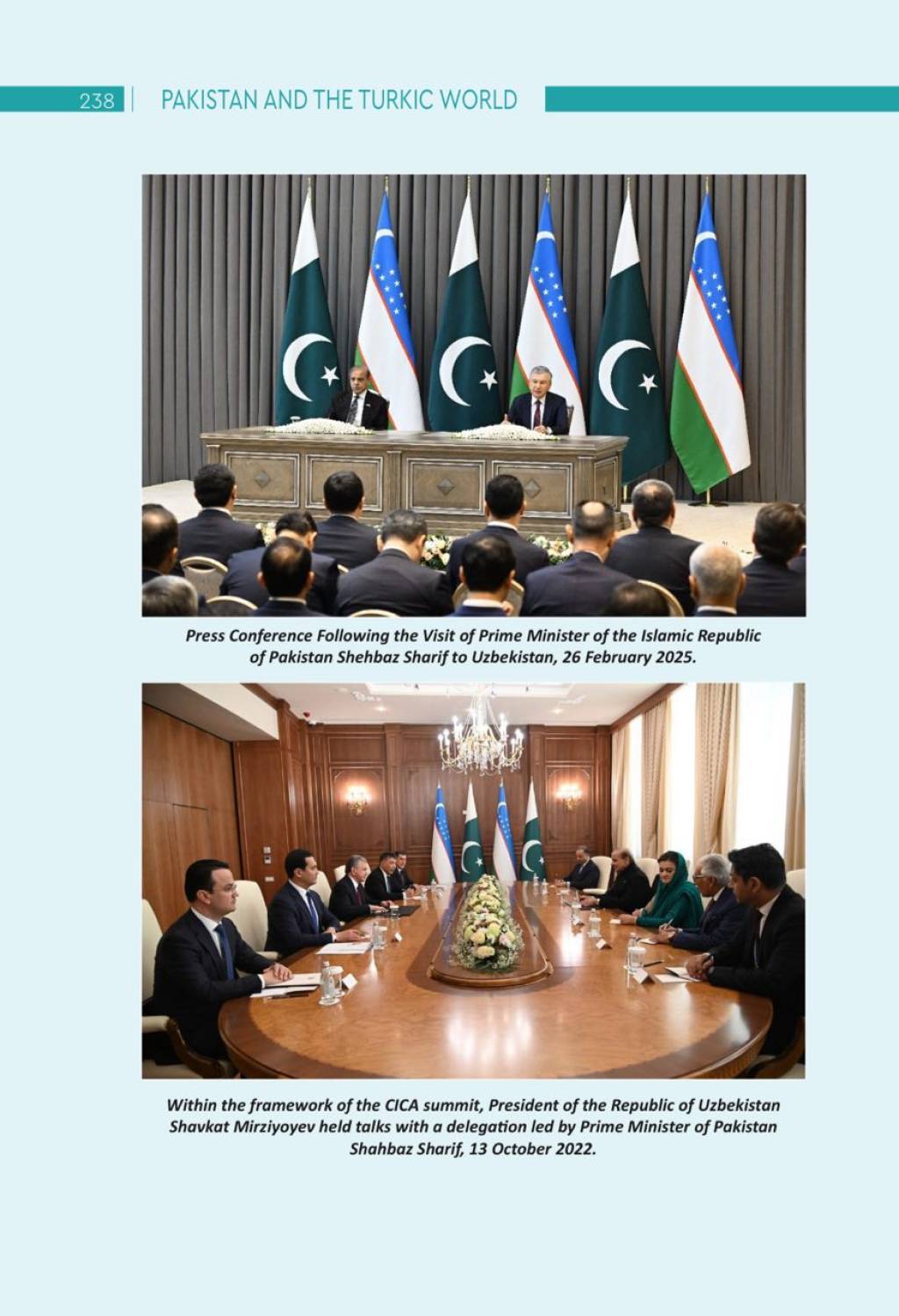 Китобда Покистоннинг Озарбайжон, Қозоғистон, Қирғизистон, Туркия, Туркманистон ва Ўзбекистон билан узоқ тарихдан бошлаб, замонавий даврга қадар давом этган муносабатлари ёритилган. Асарнинг 220–240-саҳифаларини қамраб олган саккизинчи боб — “Ўзбекистон–Покистон алоқалари: тарихий ўзаро боғлиқликнинг тикланиши” деб номланган бўлиб, Ўзбекистон Фанлар академияси вице-президенти, тарих фанлари доктори, профессор Баҳром Абдуҳалимов томонидан тайёрланган.
